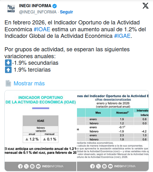 El Indicador Oportuno de la Actividad Económica (IOAE) estima anticipadamente el desempeño de la economía antes de la publicación del índice general IGAE, una referencia mensual del PIB de México.